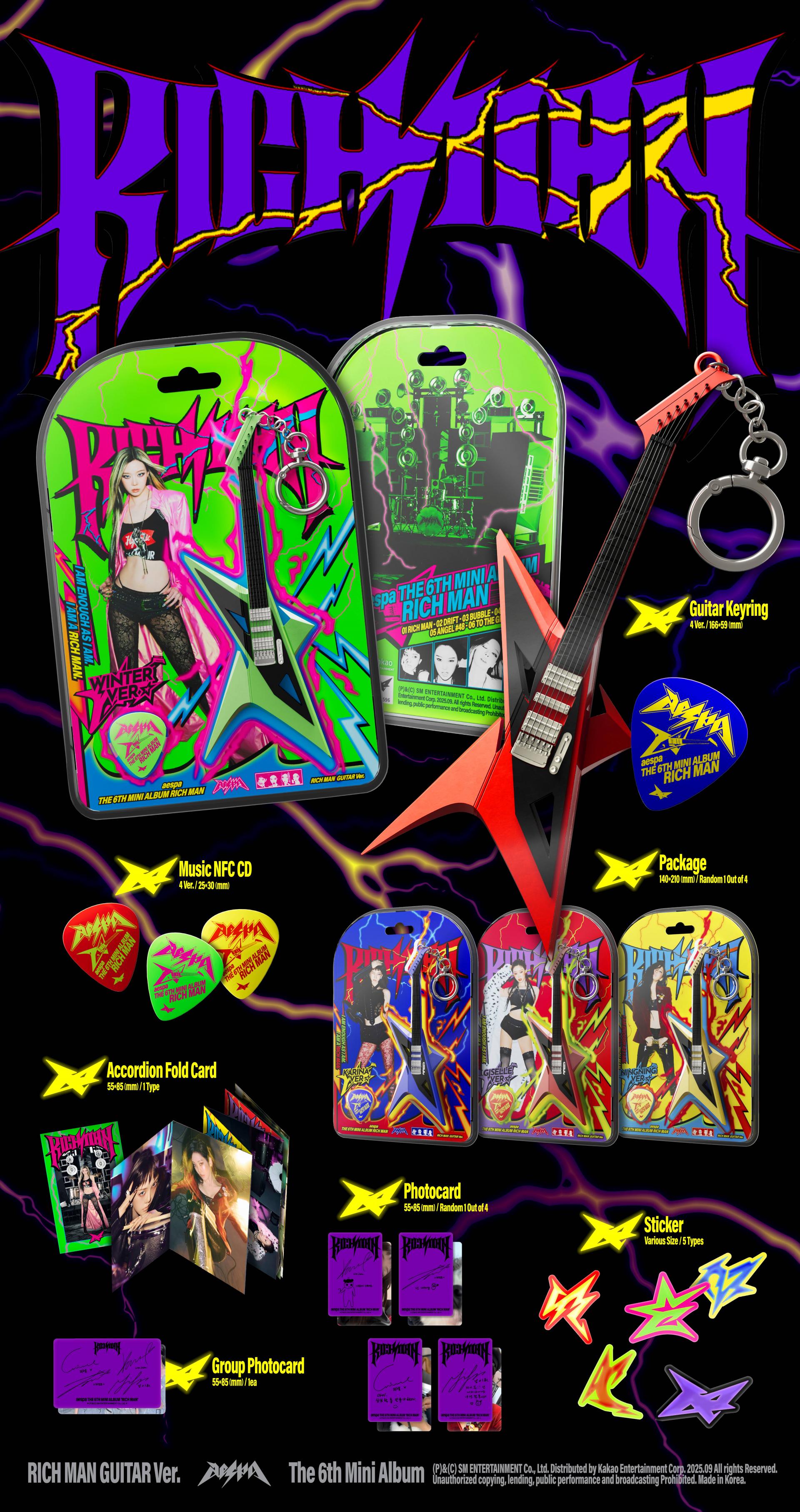 에스파 여섯 번째 미니앨범 ‘Rich Man’은 동명의 타이틀곡을 비롯해 트렌디한 매력의 총 6곡이 수록되어 있으며, 전작 ‘Dirty Work’와는 또 다른 색깔을 보여준다.