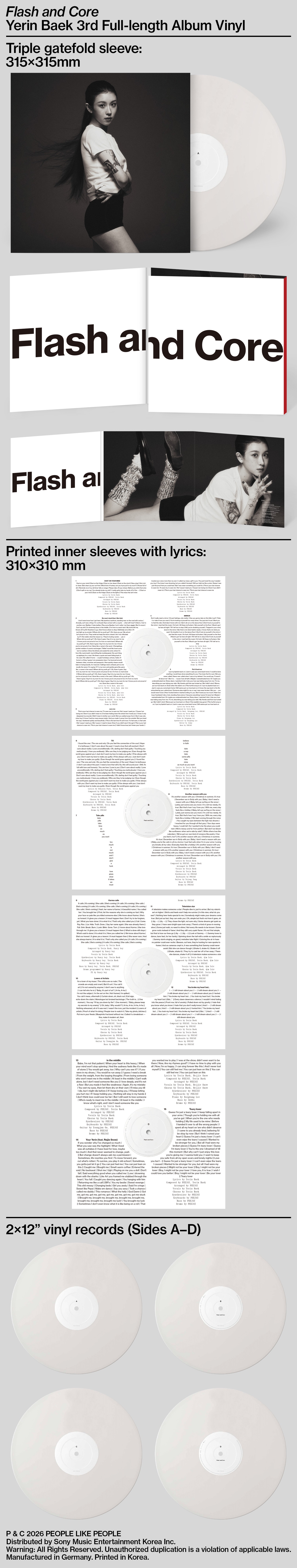 ‘Flash and Core’ 바이닐은 2LP, 180g Heavyweight White Vinyl으로 제작되며, 영국 Abbey Road Studios의 엔지니어 Miles Showell이 바이닐 마스터링과 라커 커팅을 맡아 아날로그 매체에 최적화된 사운드를 구현한다. 또한 독일 Optimal Media에서 프레싱되어 안정적인 음질과 높은 완성도를 갖춘 음반으로 완성될 예정이다.
