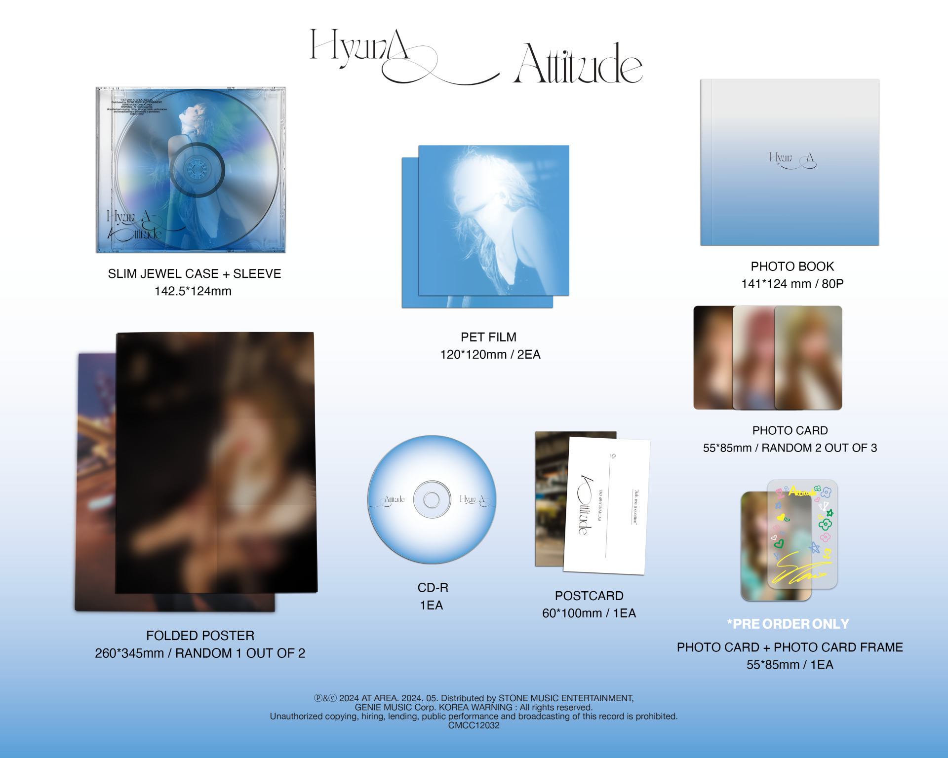 총 4곡이 수록된 EP 앨범으로 POP, Dance, R&B 등 다양한 장르를 아우르는 현아의 새로운 음악적 스펙트럼을 선보이며, 이 앨범을 통해 현아가 보컬적으로도 한 단계 성장한 면모를 확인할 수 있다. 앳에어리어의 수장이자 K-POP, 힙합 등 다양한 장르를 대표하는 프로듀서팀 그루비룸이 총괄 프로듀싱으로 참여하였으며, 현아는 가사의 콘셉트, 뮤비 기획 등 전반적인 앨범 제작 과정과 음악 작업에도 직접적으로 참여하였다. 이로써 현아의 솔직하고 당당한 태도와 변화무쌍한 매력을 담아낸 앨범 EP [Attitude]가 오는 5월 2일 발매된다.